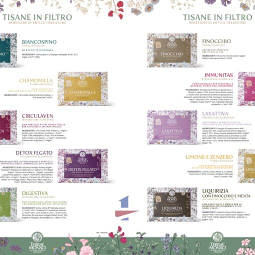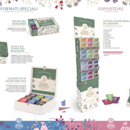 Oltre a queste CAPSULE VEGETALI e LINEA COSMESI, la linea Terrae Monaci ha TISANE FUNZIONALI e una serie di FITOPREPARATI. Tutti i prodotti possono essere Confezionati ed Allestiti in FORMATI SPECIALI.