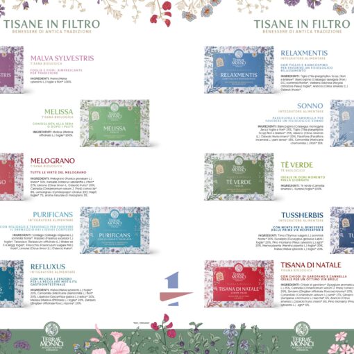Oltre a queste CAPSULE VEGETALI e LINEA COSMESI, la linea Terrae Monaci ha TISANE FUNZIONALI e una serie di FITOPREPARATI. Tutti i prodotti possono essere Confezionati ed Allestiti in FORMATI SPECIALI.